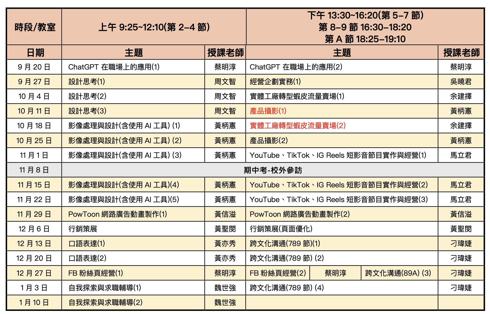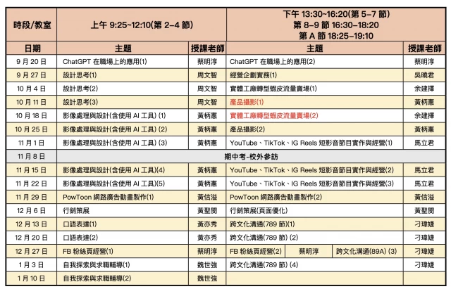 本學期課程主要方向為『溝通與行銷技能強化』及『企業管理與專業知識』
